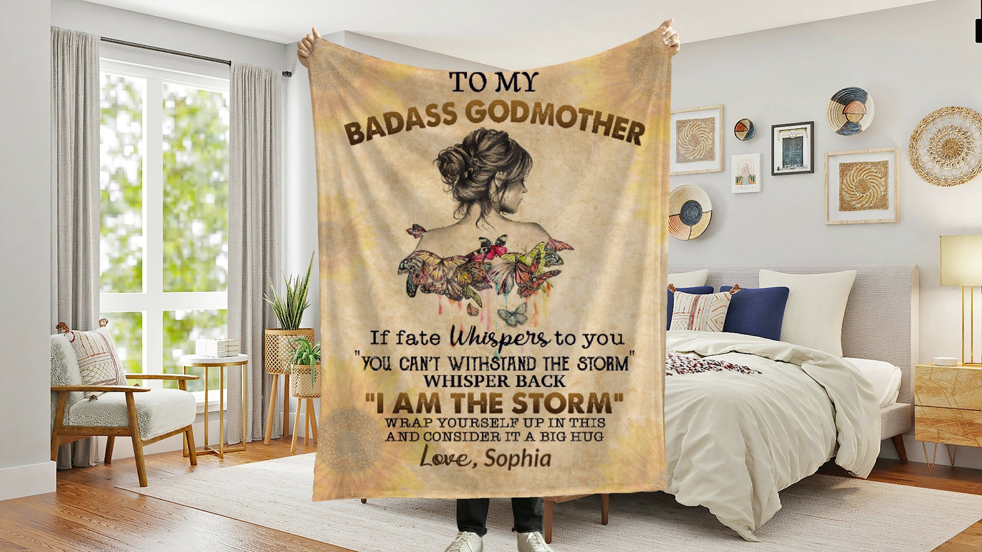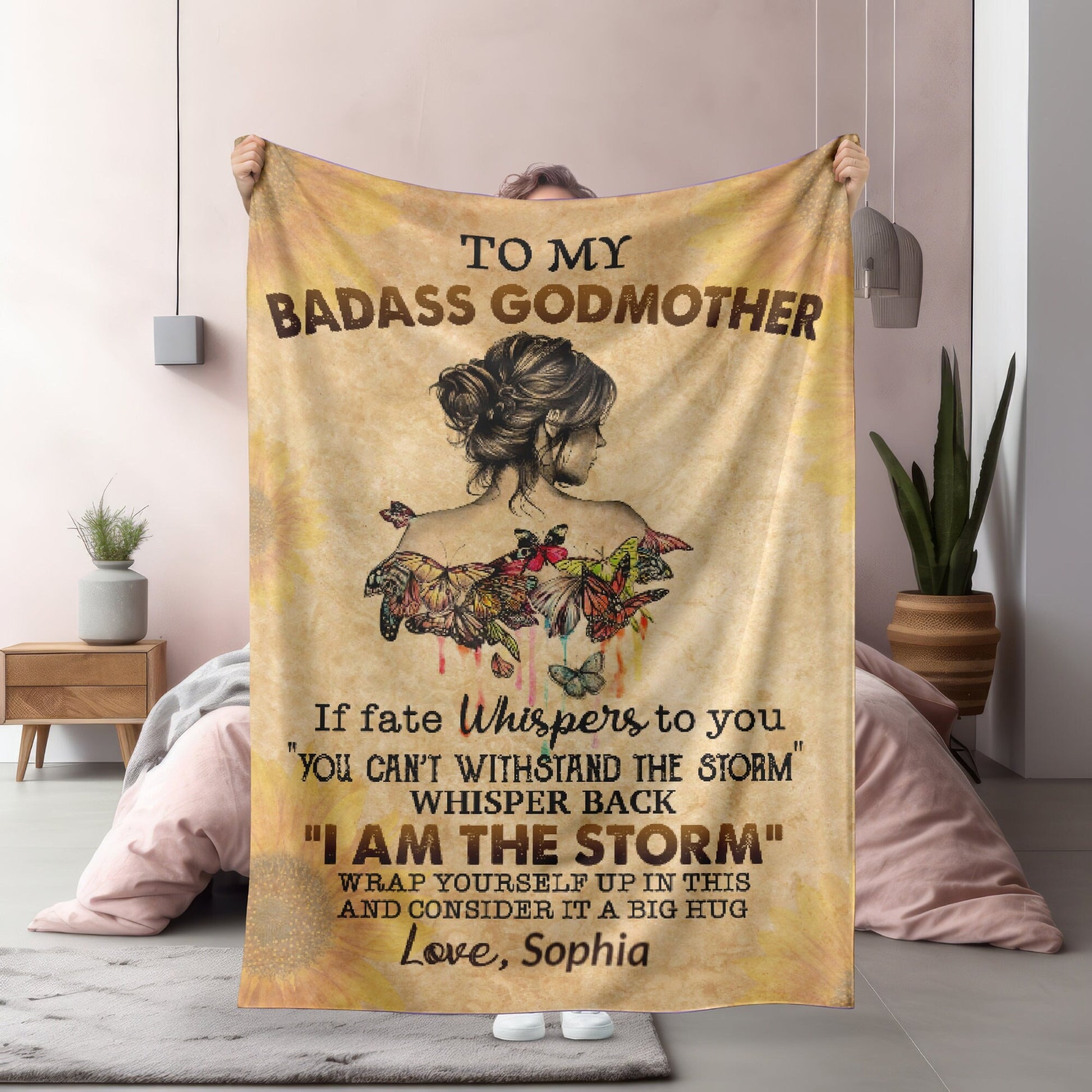 Wrap Your Godmother in Love and Inspiration with Our Custom Blanket! This cozy and stylish throw blanket features a powerful message for your badass godmother, reminding her of her strength and resilience. Perfect for birthdays, special occasions, or just because, this motivational quote blanket is a heartfelt gift from a godchild.