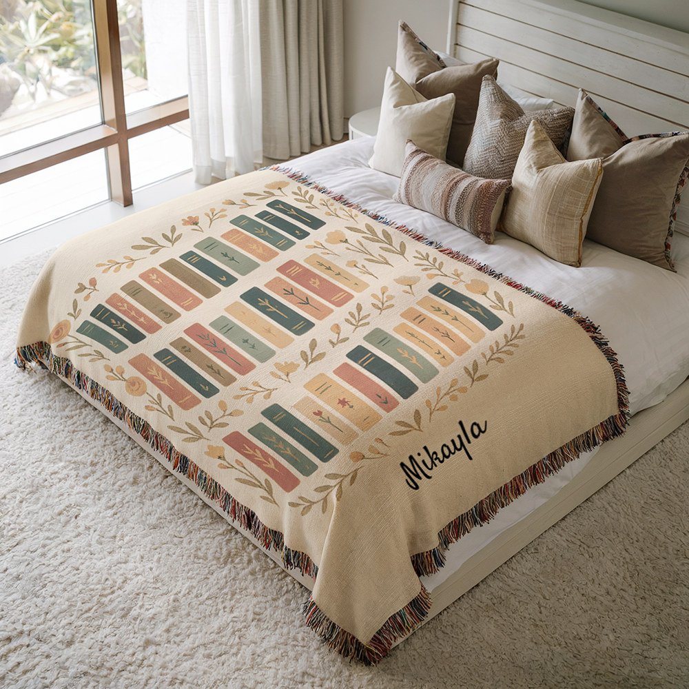 Personalized Book Lovers Blanket | Custom Name Woven Throw | Aesthetic Bookshelf Design | Literary Gift for Her